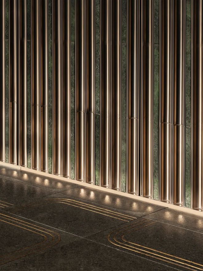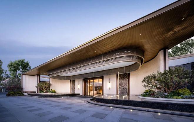 门口约32米的巨幅门庭更让艳姐移不开眼。三重弧形暖色石材与金属交织,水影与光影缠绵。还没进门,高奢星级酒店的尊贵感便扑面而来。