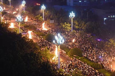 7月27日,“清凉夏日·燃情火把”——凉山彝族火把文化狂欢体验活动在四川省西昌市城区、洛古波火把广场、大箐乡诗歌小镇等地上演。伴随着欢快的音乐,跳动的火苗,人们围着篝火跳起达体舞,感受彝族火把文化的魅力。据不完全统计,约51.98万人次参与了当晚的火把节狂欢。图为四川省西昌市城区凉山彝族火把文化狂欢体验活动现场。